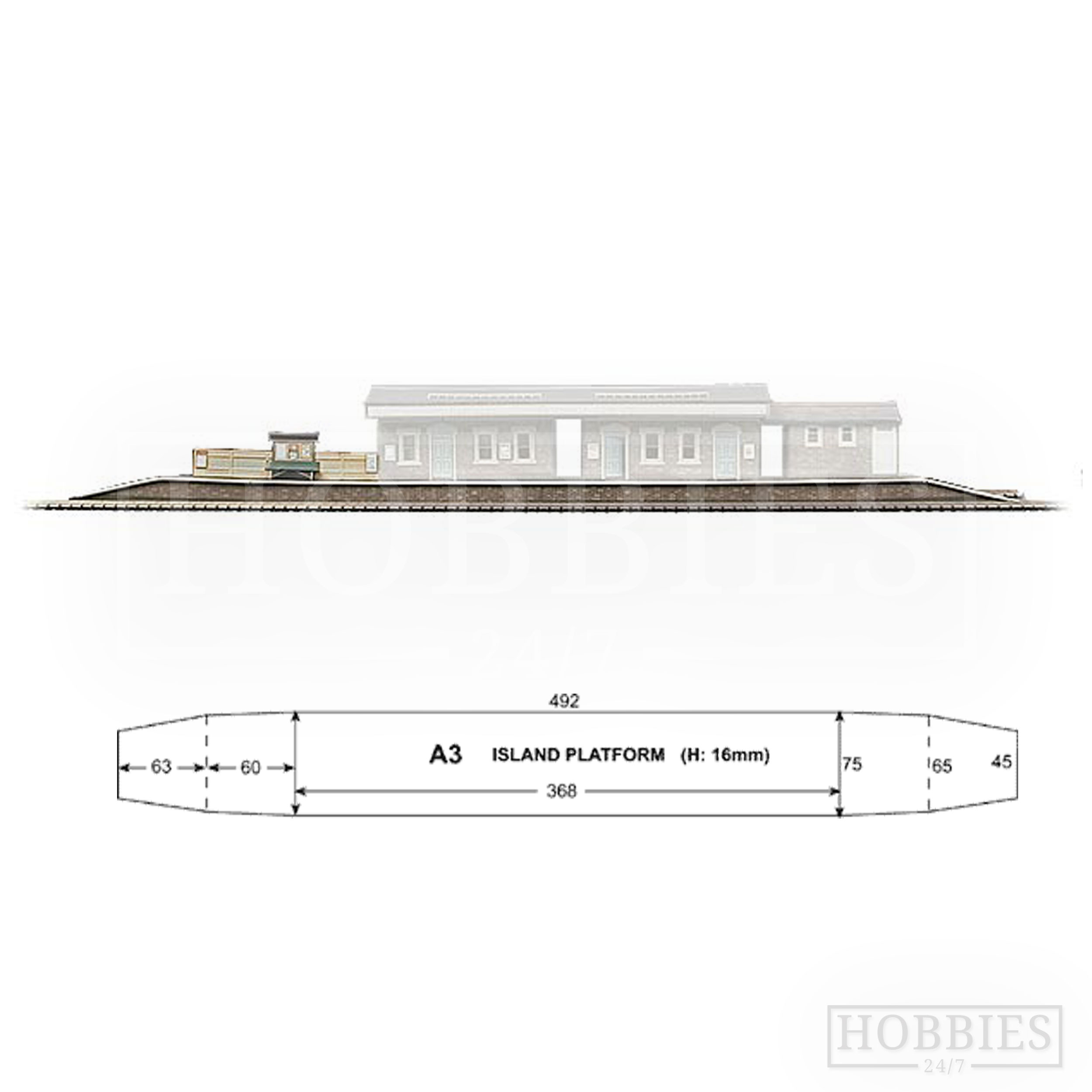 A platform designed to fit between two tracks in a station. Designed in a typical fashion with a ramp at either end. In outlying stations passengers would have to walk the length of the platform and down the ramp to cross the tracks.