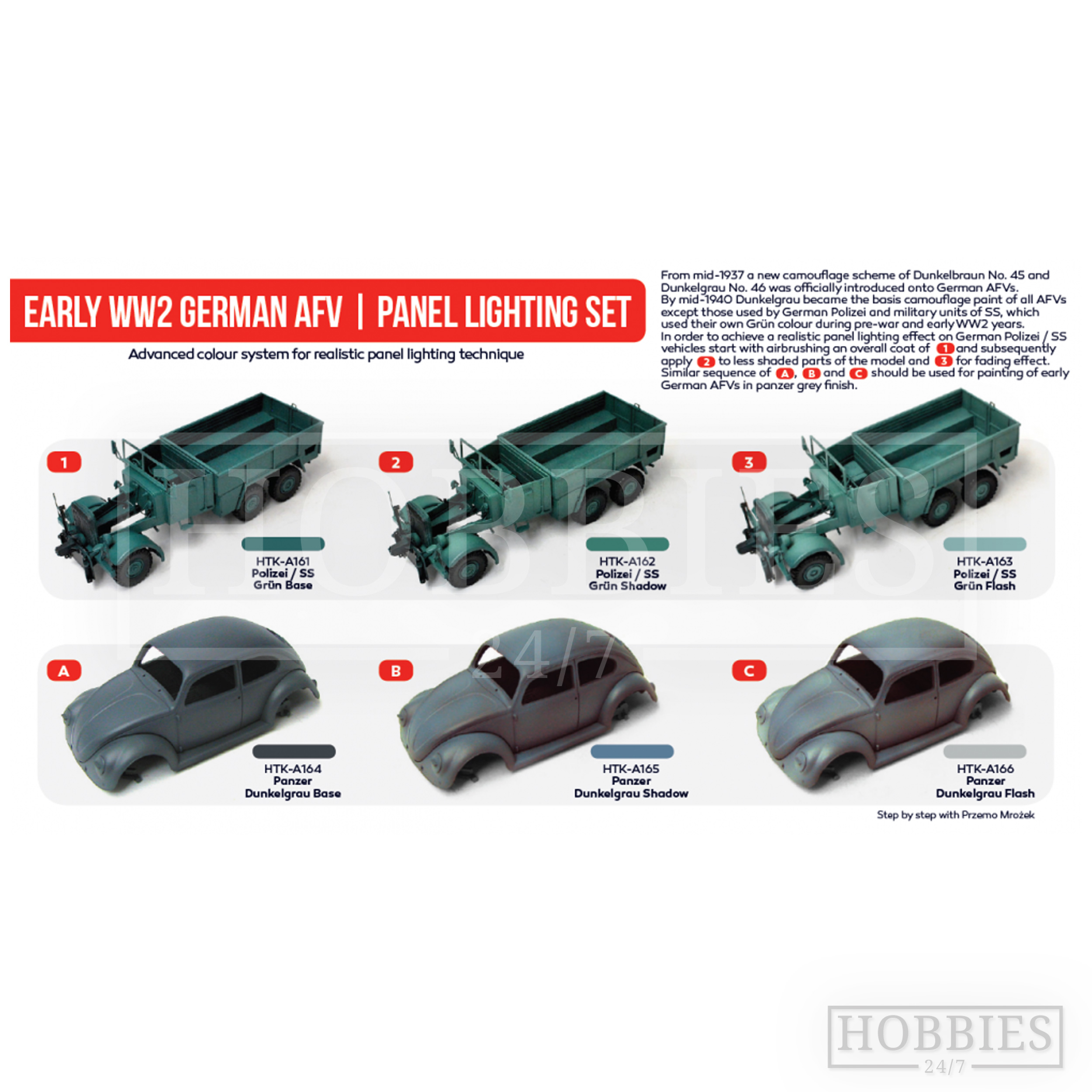 Similar sequence of HTK-A164 Panzer Dunkelgrau Base, HTK-A165 Panzer Dunkelgrau Shadow and HTK-A166 Panzer Dunkelgrau Flash should be used for painting of early German AFVs in panzer grey finish.